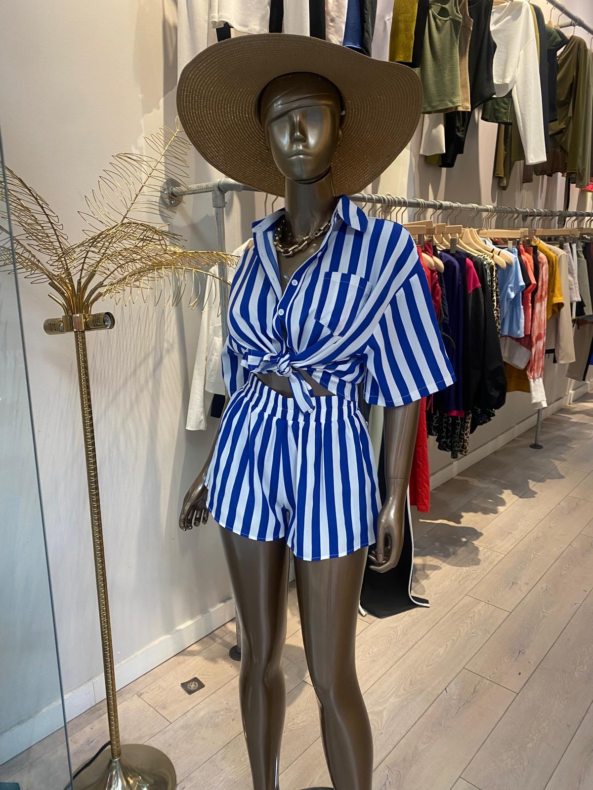 - Style: Breezy, lightweight button-down shirt paired with relaxed, loose-fitting shorts, offering a classic striped design with a playful and sophisticated twist.